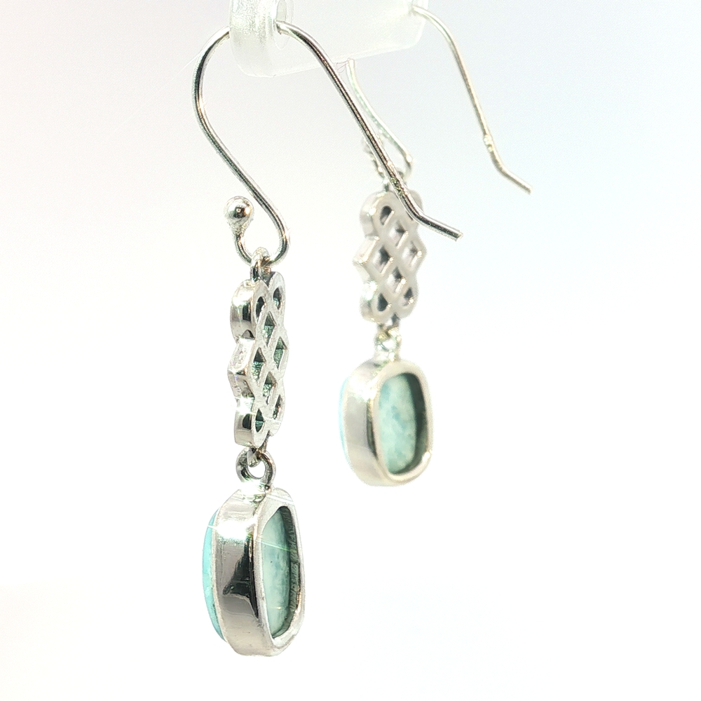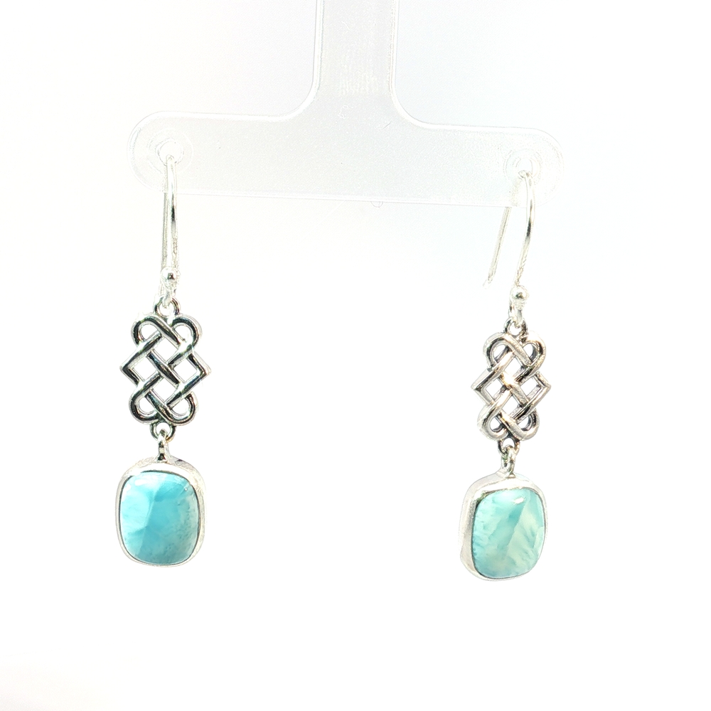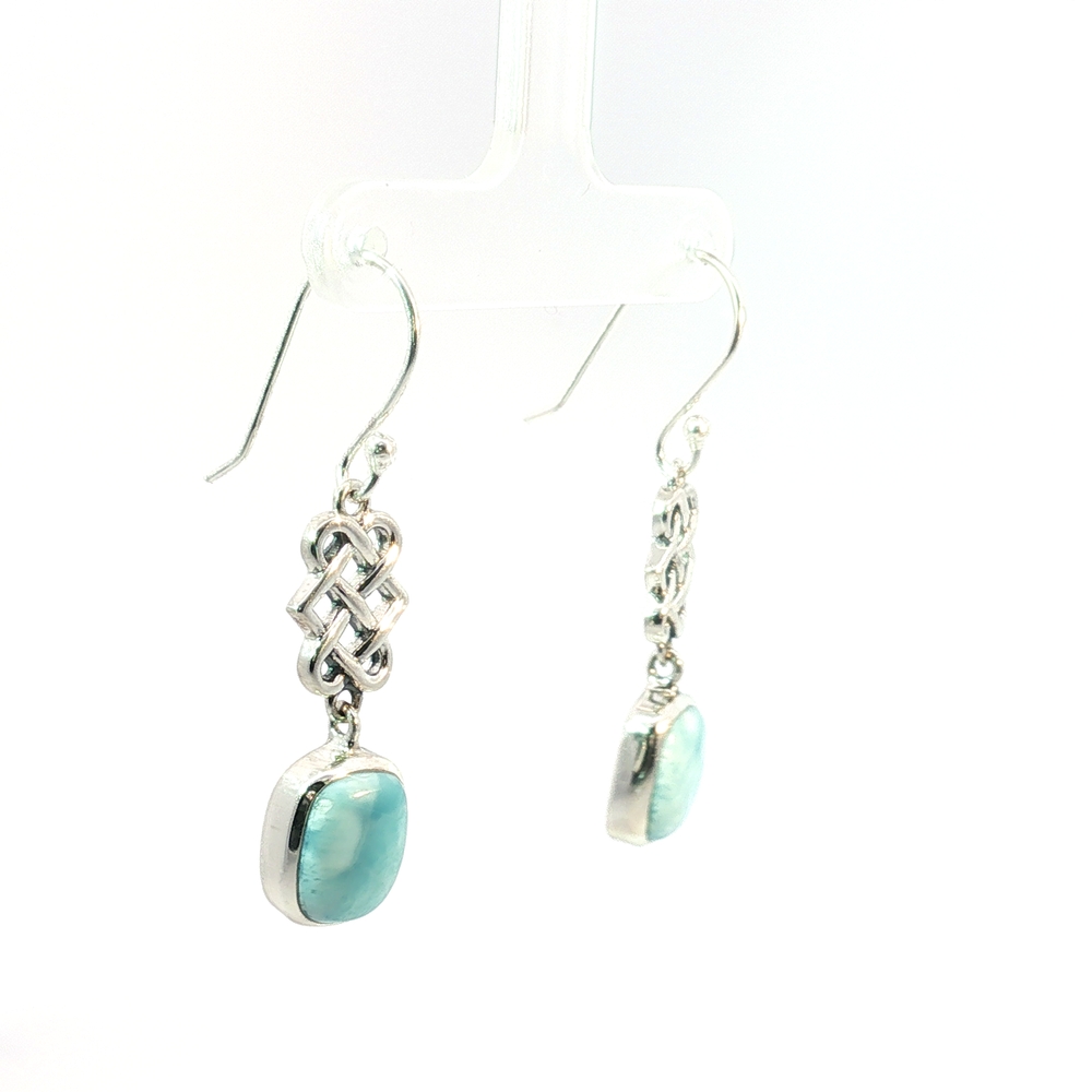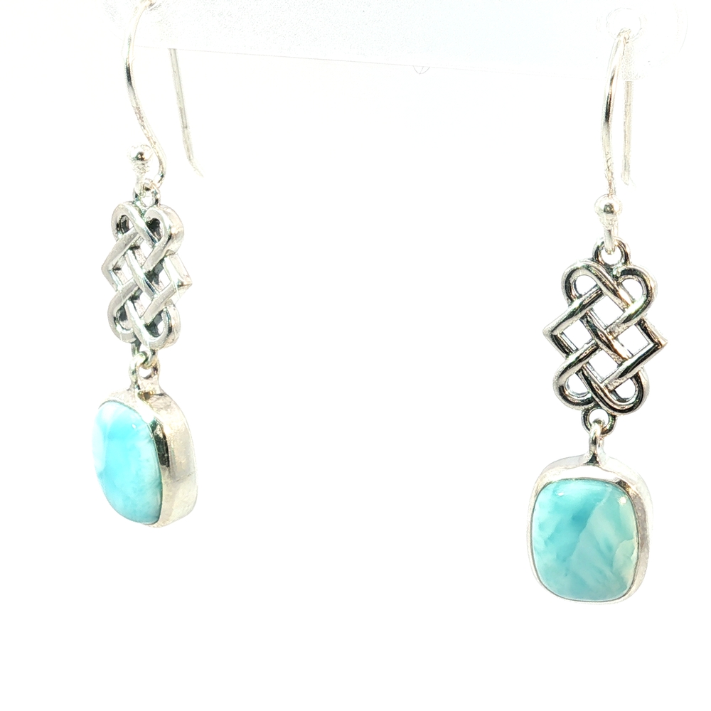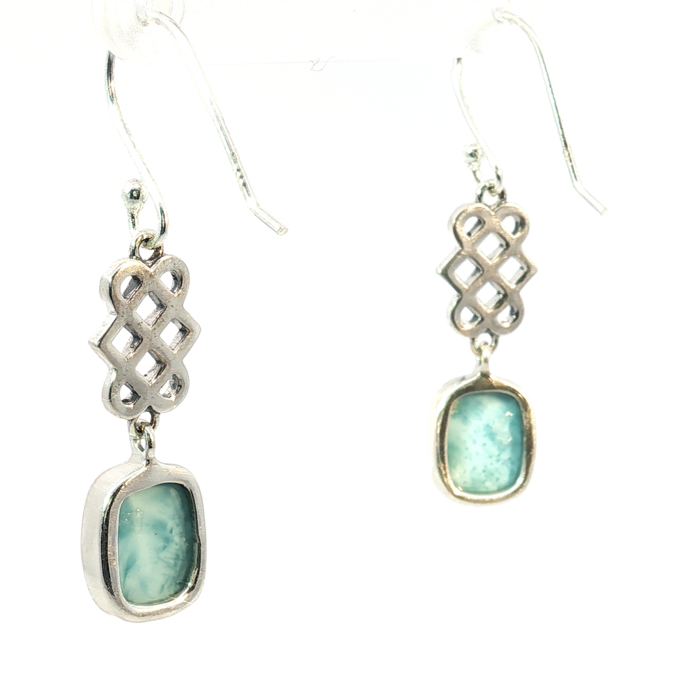 These serene Celtic Knot Larimar Drop Earrings feature genuine natural Larimar, prized for its tranquil sea-blue and turquoise hues found only in the Dominican Republic. Set in polished sterling silver, each Larimar gemstone displays unique marbling reminiscent of ocean waves — no two stones are alike.