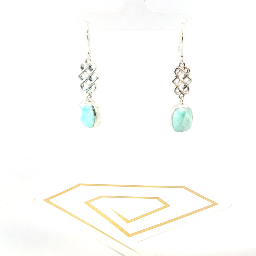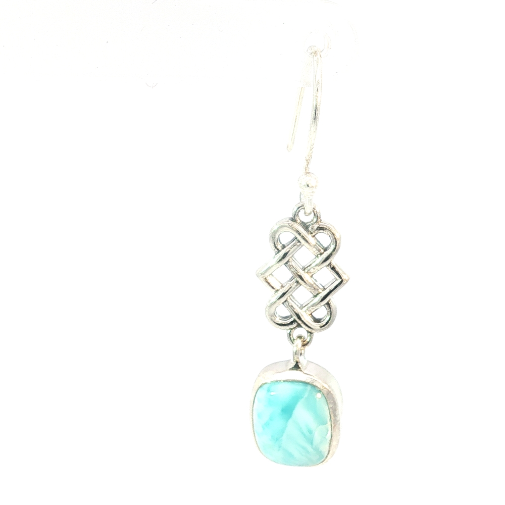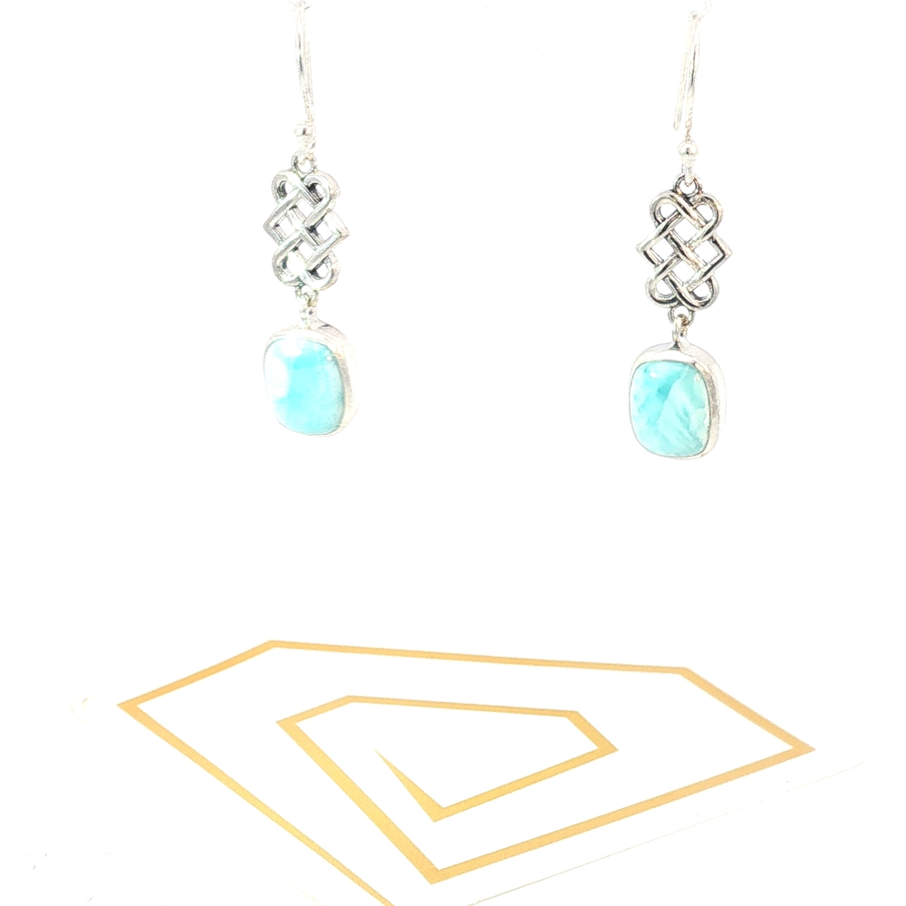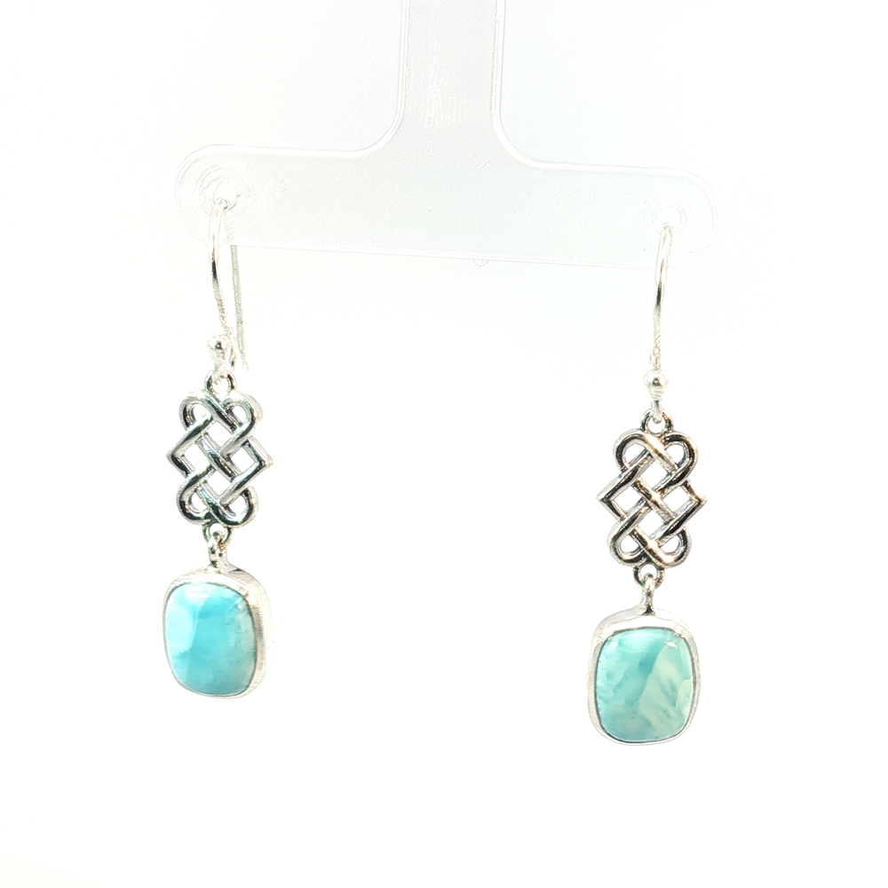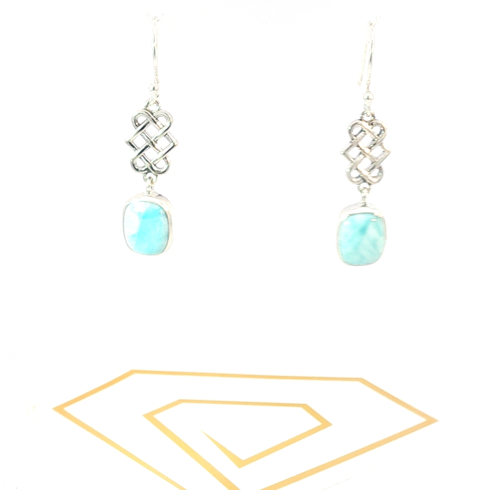 These serene Celtic Knot Larimar Drop Earrings feature genuine natural Larimar, prized for its tranquil sea-blue and turquoise hues found only in the Dominican Republic. Set in polished sterling silver, each Larimar gemstone displays unique marbling reminiscent of ocean waves — no two stones are alike.