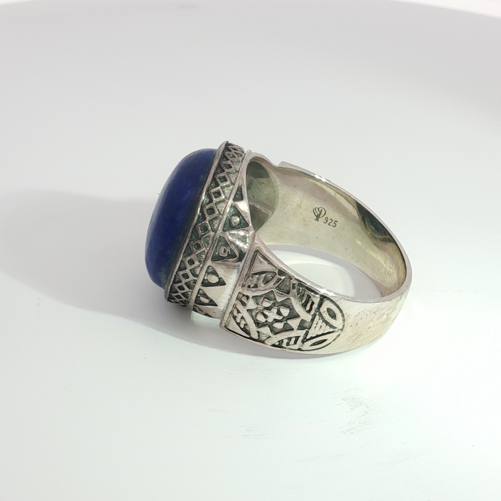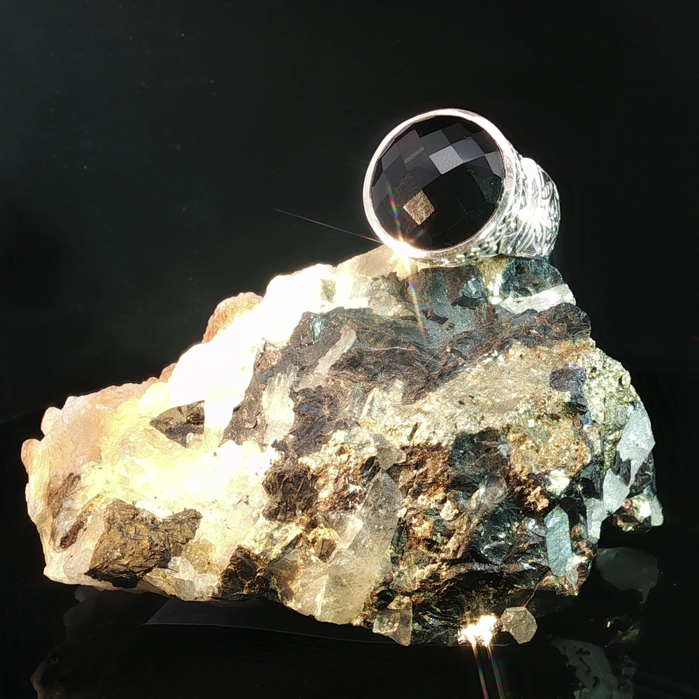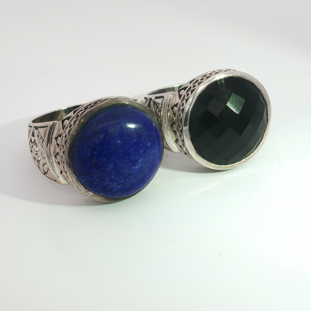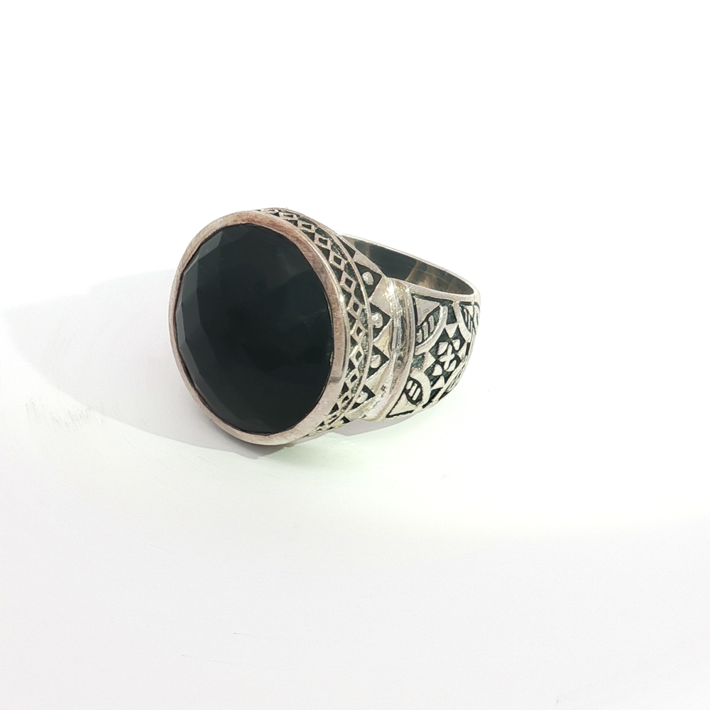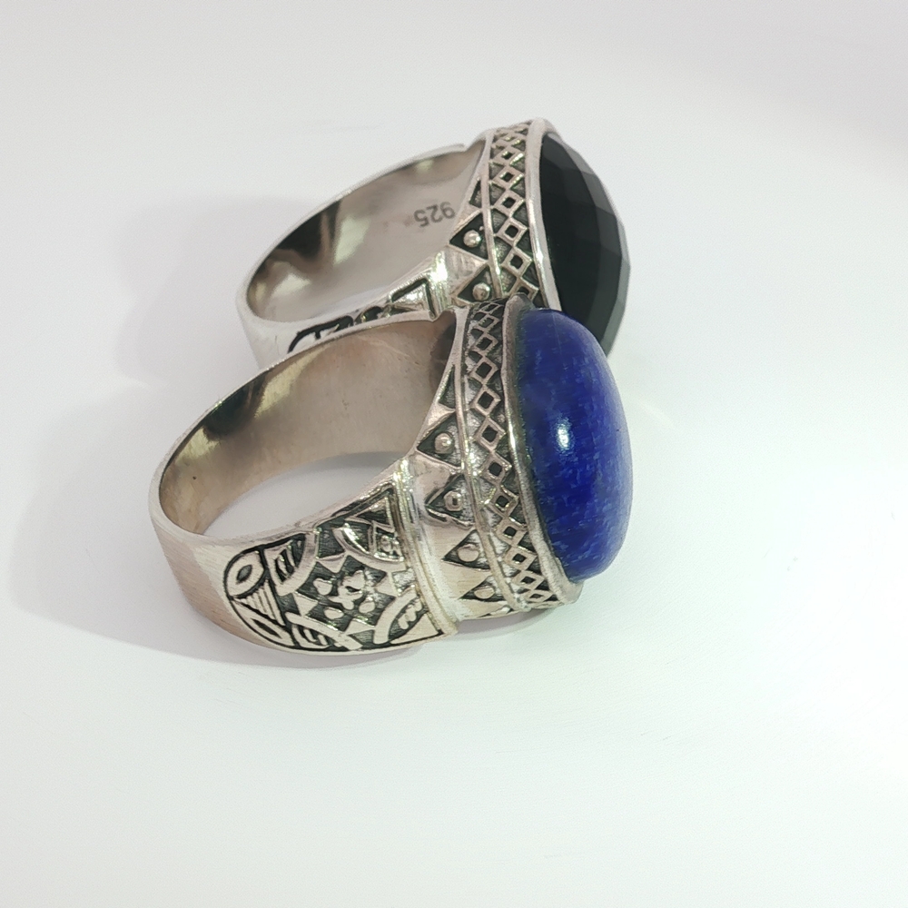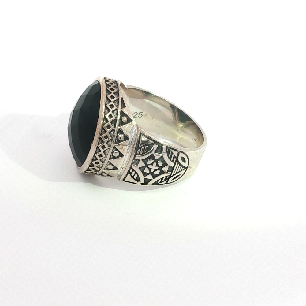 Command attention with the Bold Black Onyx Statement Ring in Sterling Silver, a striking unisex design that blends strength with sophistication (Also available in gorgeous Round Cabochon Lapis). This impressive ring showcases a large, faceted black onyx gemstone, framed by an intricately detailed sterling silver band with ornate patterns that echo timeless craftsmanship. Black onyx is known as a stone of grounding and protection, making this ring more than just jewelry—it’s a symbol of resilience and inner strength. Perfect for men or women who favor bold, expressive accessories, this versatile piece pairs effortlessly with both casual and formal looks.